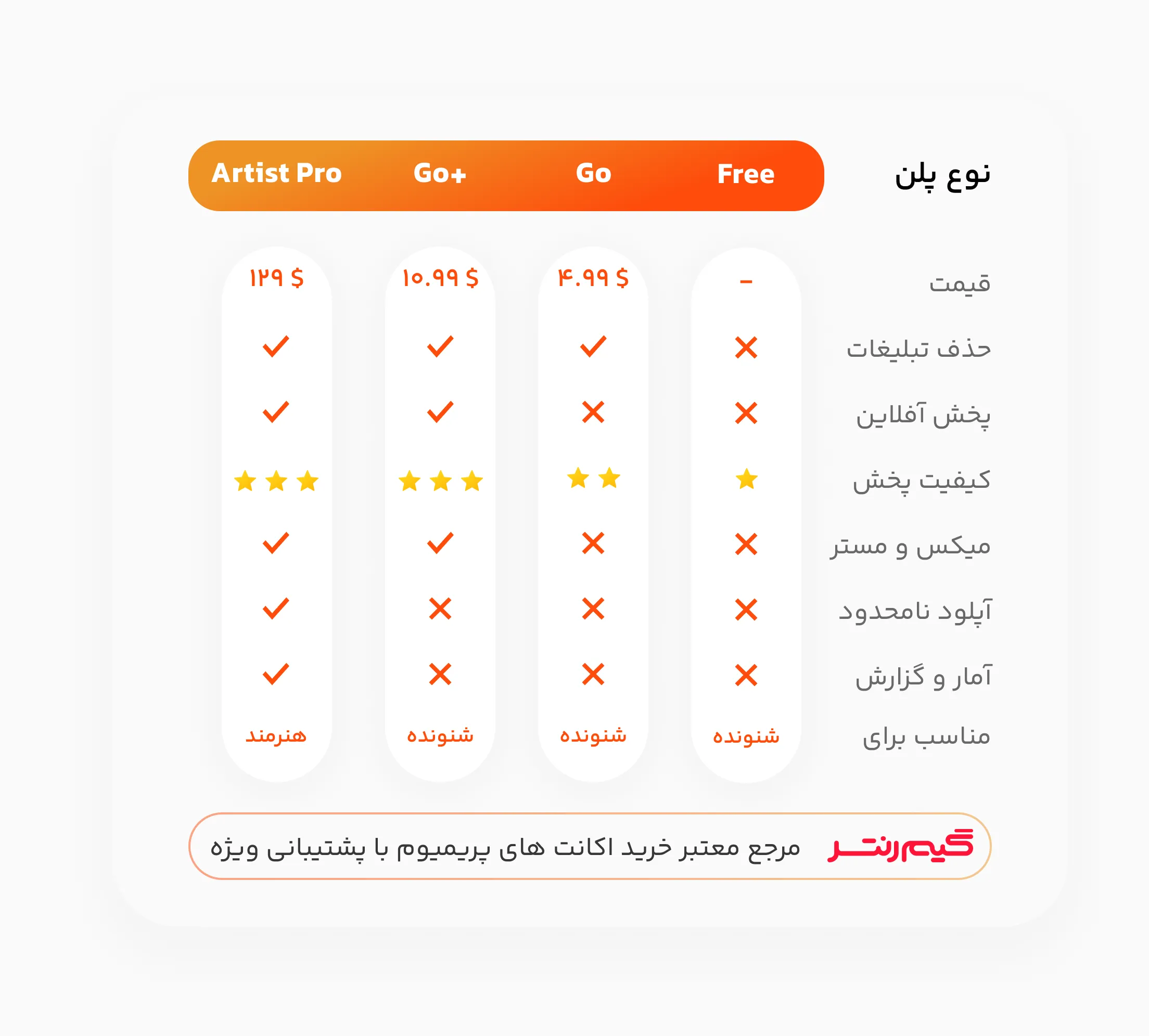 بسته به نوع استفاده شما، دو تعرفه Go Plus برای کاربر (شنونده معمولی) و Next Pro (Artist Pro) برای آرتیست (صاحب اثر آهنگ) قابل ارائه هست.